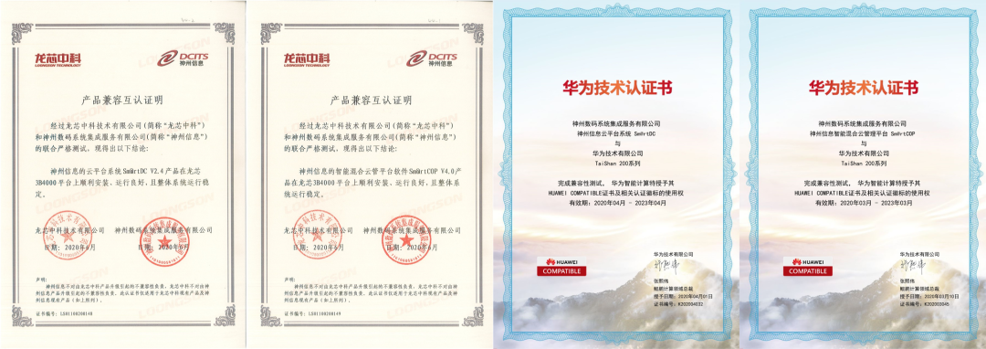 神州信息自研的容器云平台-神州云鼎(Sm@rtDC)及神州信息混合云管理平台-神州云帆(Sm@rtCOP)双双通过了信创领导组织“龙安联盟”创始企业之一的龙芯中科及科技界翘楚华为的技术认证,确认了神州云鼎和神州云帆完全可以运行在基于龙芯中科的龙芯MIPS CPU和华为的源于鲲鹏ARM CPU的TaiShan服务器上。