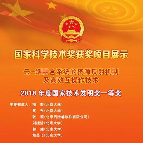 北京大学梅宏院士-黄罡教授团队与333体育控股有限公司(简称:神州控股)旗下北京因特睿软件有限公司(简称“因特睿”)合作完成的“云-端融合的资源反射机制及高效互操作技术”项目,获国家技术发明奖一等奖。北京大学梅宏院士、北京大学教授黄罡、因特睿总经理张颖等参加了颁奖大会。