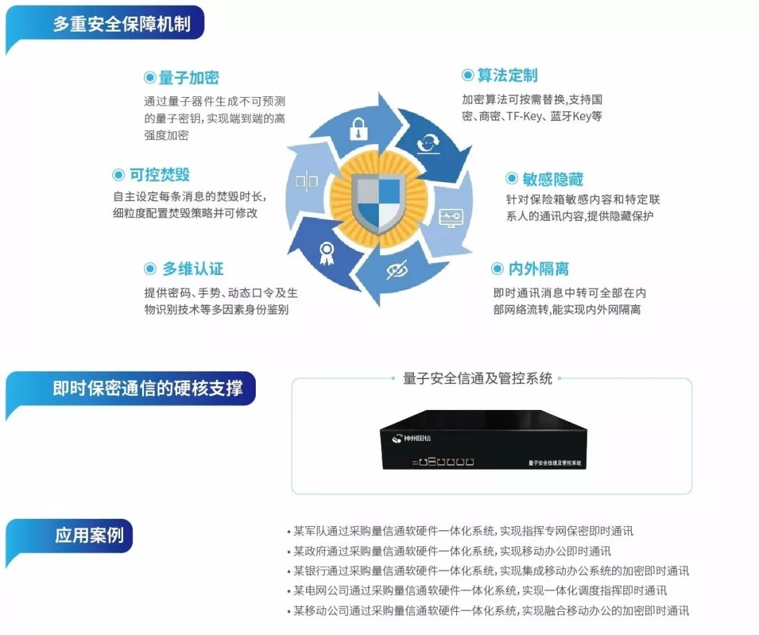 近期,神州信息成员企业神州国信基于金融、政府、军队军工、电力、能源等多个国家关键行业及企业级客户的即时加密通讯需求,自主研发推出新一代企业级即时通讯工具“量信通”,直接利用量子密钥加密解决消息、语音、文件、图片等在即时通信过程中的高安全传输及高安全存储问题。