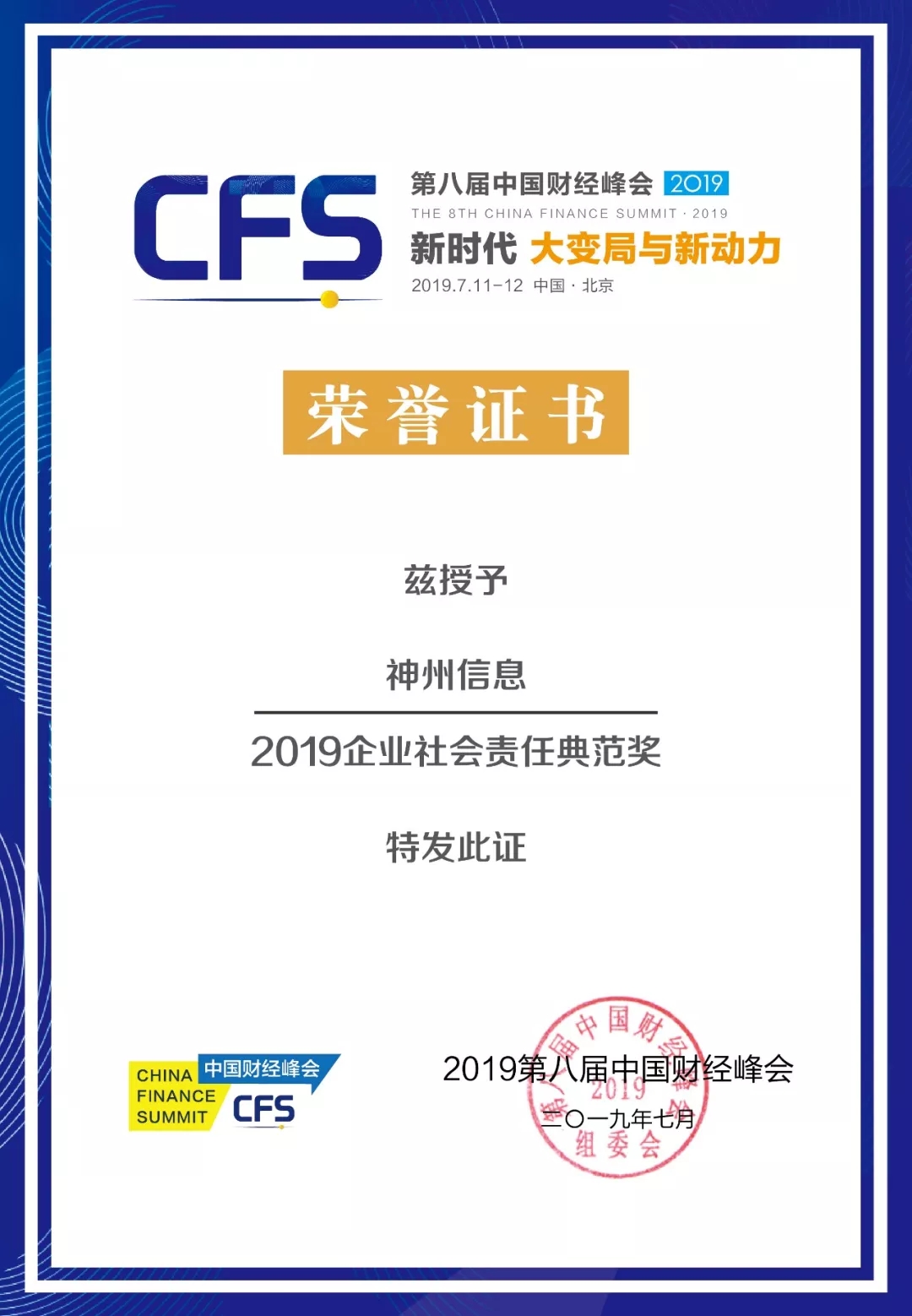 第八届中国财经峰会丨神州信息荣获2019企业社会责任典范奖